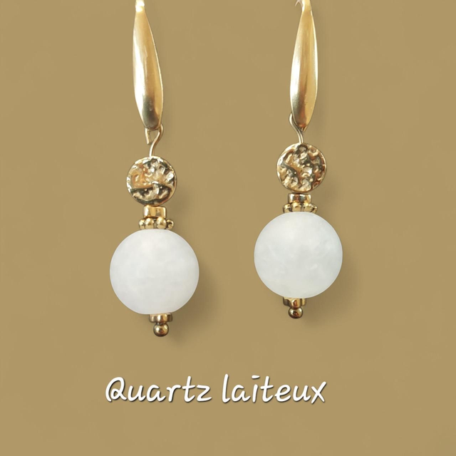 Boucles d'oreilles "Essence de pureté" en Quartz laiteux et Hématite dorée pour femme